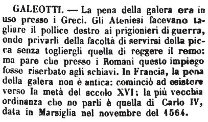 Galeotti - La pena della galera era in uso presso i Greci. Gli Ateniesi facevano tagliare il pollice destro ai prigionieri di guerra, onde privarli della facoltà di servirsi della picca senza togliergli quella di reggere il remo: ma pare che presso i Romani questo impiego fosse riserbato agli schiavi. In Francia, la pena della galera non è antica: cominciò ad esistere verso la metà del secolo XVI; la più vecchia ordinanza che ne parli è quella di Carlo IV, data in Marsiglia nel novembre del 1564. [immagine]