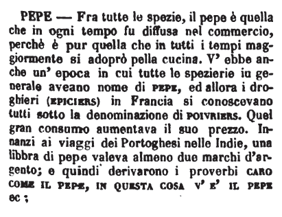 | Pepe - Fra tutte le spezie, il pepe è quella che in ogni tempo fu diffusa nel commercio, perchè è pur quella che in tutti i tempi maggiormente si adoprò pella cucina. V'ebbe anche un'epoca in cui tutte le spezierie in generale aveano nome di pepe, ed allora i droghieri (epiciers) in Francia si conoscevano tutti sotto la denominazione di poivriers. Quel gran consumo aumentava il suo prezzo. Innanzi ai viaggi dei Portoghesi nelle Indie, una libbra di pepe valeva almeno due marchi d'argento; e quindi derivarono i proverbi caro come il pepe, in questa cosa v'è il pepe ec; [immagine] |